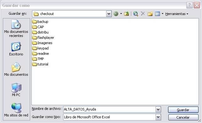 Guardar la planilla ALTA_DATOS.XLS con otro nombre como por ej. ALTA_DATOS_AYUDA.XLS, el objetivo de esta acción es dejar guardado el archivo original para su futuro uso. Dentro del Excel, dirigirse al menú "Archivo - Guardar Como". Luego modificar el nombre de archivo y por último presionar el botón Guardar.