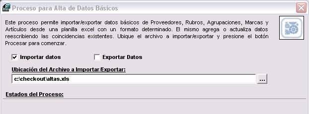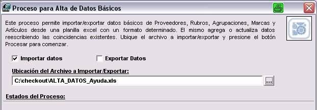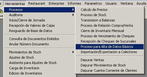 Para importar la planilla ALTA_DATOS_AYUDA al sistema Checkout Store Backoffice abrir el mismo y dirigirse al menú "Herramientas - Procesos - Proceso para Alta de Datos Básicos".