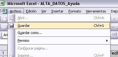 Guardar la planilla ALTA_DATOS_AYUDA, presionando en el menú de Excel "Archivo - Guardar".