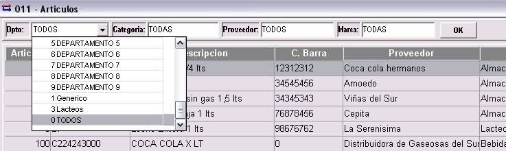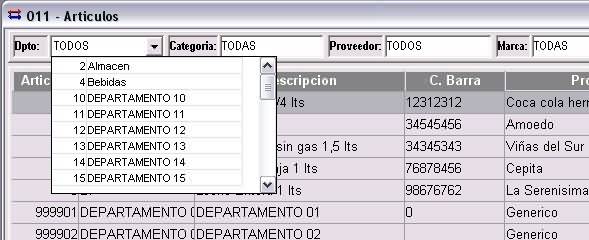 Dando un clic con el mouse sobre el cuadro de texto ubicado a la derecha del ítem Dpto., se desplegará una lista con los diferentes departamentos existentes en el sistema.