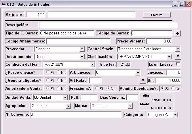 Indica el código interno del artículo. El sistema propone un número (comenzando del 1). El usuario puede modificar este valor. Es obligatorio poner un valor y el mismo no puede repetirse. Junto al código del artículo se ingresa una descripción reducida del mismo.