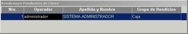 En la misma ventana de "Inicio/Cierre de Jornada", se pueden visualizar las rendiciones pendientes de los operadores. En el caso que exista alguna rendición pendiente de alguno de los operadores, no se podrá cerrar o iniciar jornada (los botones no están visibles).