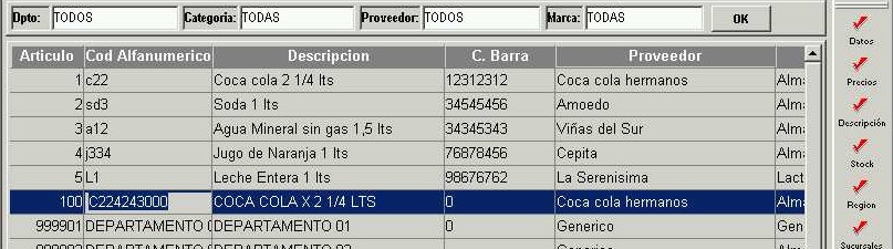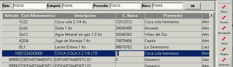 Seleccionamos nuevamente al artículo "100 – COCA COLA 2 1/4.LTS", y presionamos el botón Sucursales de la barra de herramientas.