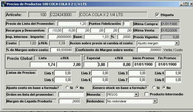 Nos posicionamos en el artículo "100 – COCA COLA 2 1/4.LTS" y presionamos el botón PRECIOS de la barra de herramientas. Otra forma de acceder es ir al menú "Artículos - Datos de Precios" de la barra de menú.