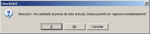 Al terminar de cargar los datos, presionamos el botón Guardar o tecla F10. Nos presenta un cuadro de diálogo, que nos pregunta si queremos poner el precio en vigencia inmediatamente, en este caso optamos por "No". Luego presionamos el botón Cerrar.