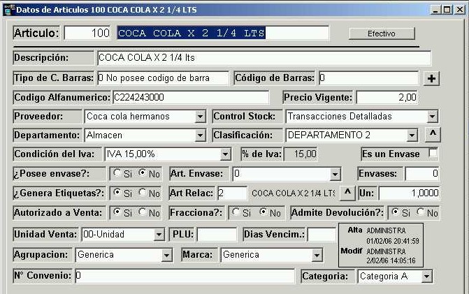 Al regresar a datos del artículo "100 – COCA COLA 2 1/4.LTS", podemos observar que el precio vigente a cambiado a $ 2,00.