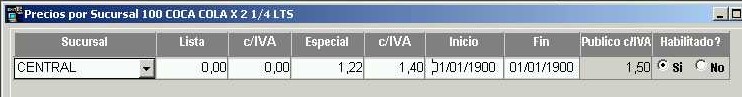 Editamos el campo "C/IVA" de la sucursal CENTRAL, ingresando el precio $ 1,40 (hay dos campos con ese nombre, modificar el segundo).
