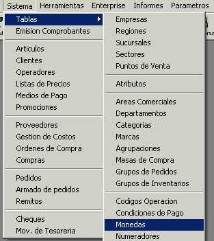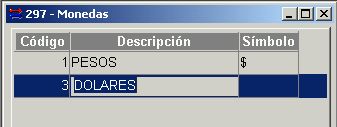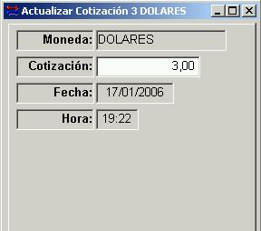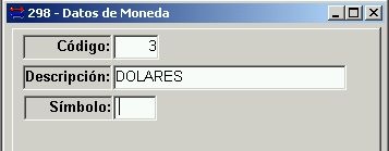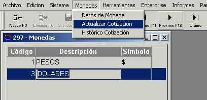 Para crear nuevas monedas debemos acceder al menú "Sistema - Tablas - Monedas" de la barra de menú y presionar la tecla F3 o el botón Nuevo. Luego Ingresamos los datos solicitados y presionamos el botón Guardar o la tecla F10. Para asignarle la cotización, debemos posicionarnos sobre la nueva moneda creada (ejemplo: DÓLARES) y acceder al menú "Monedas - Actualizar Cotización" de la barra de menú o presionar el botón "Cotización" de la barra de herramientas. En las siguientes imágenes se muestra en forma ordenada los pasos a seguir para crear y cotizar una nueva moneda.
