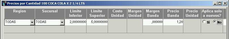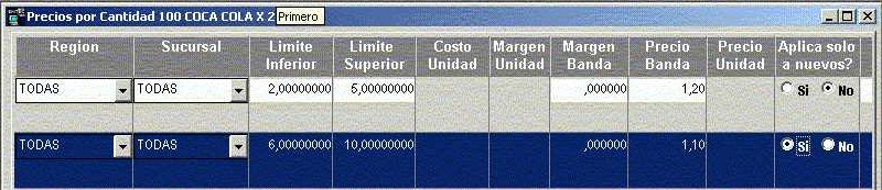Presionamos el botón Nuevo o la tecla F3 para crear un nuevo registro. Establecemos un rango de productos de 2 a 5 y un precio de $ 1,2. En el casillero de "Aplica solo a nuevos?" seleccionamos NO. Luego guardamos presionando la tecla F10 o el botón Guardar.