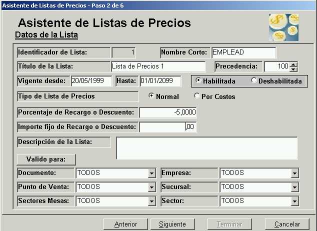 Datos solicitados en el Asistente de Listas de Precios (Paso 2 de 6)