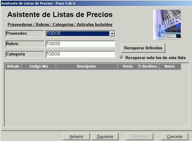 Datos solicitados en el Asistente de Listas de Precios (Paso 3 de 6)