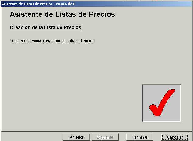 Para terminar, y crear esta lista de precios, presionamos el botón de TERMINAR y luego en SALIR.