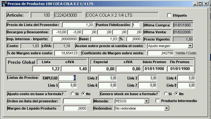 Nos posicionamos en el artículo "100 – COCA COLA 2 1/4.LTS" y presionamos el botón PRECIOS de la barra de herramientas o accedemos a través del menú "Artículos - Datos de Precios". Dentro de la ventana de precios, ingresamos un precio global de $1,40, eliminamos los datos del precio especial y, por último, guardamos y ponemos en vigencia el precio del artículo.