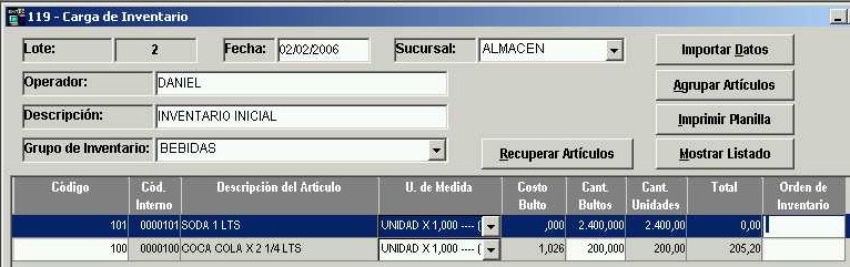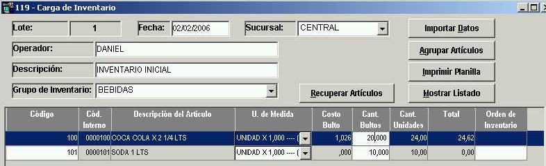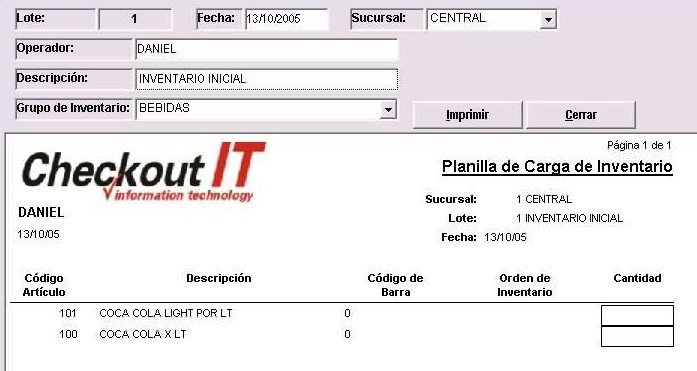 Presionar el botón CERRAR para volver a la ventana principal. Cuando la planilla impresa haya sido completada con las cantidades de los artículos del grupo de inventario BEBIDAS, podemos almacenar en el sistema esos datos que están en papel.