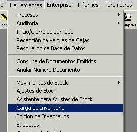 Para comenzar ingresar al menú "Herramientas - Carga de Inventario" de la barra de menú.