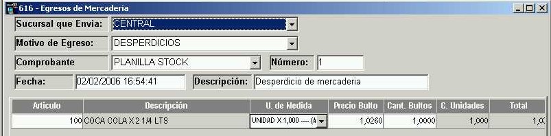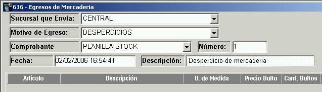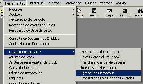 Acceder al menú "Herramientas - Movimientos de Stock - Egresos de Mercadería", a continuación se visualizará la ventana de egresos de mercadería.