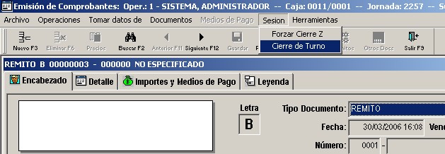 Dentro de "Emisión" ir al menú "Sesión" de la barra de menú y seleccionar la opción "Cierre de turno". Luego de seleccionar esta opción el sistema le solicitará un usuario y contraseña de un operador ADMINISTRADOR, debe ingresar los datos solicitados y presionar el botón "Aceptar".