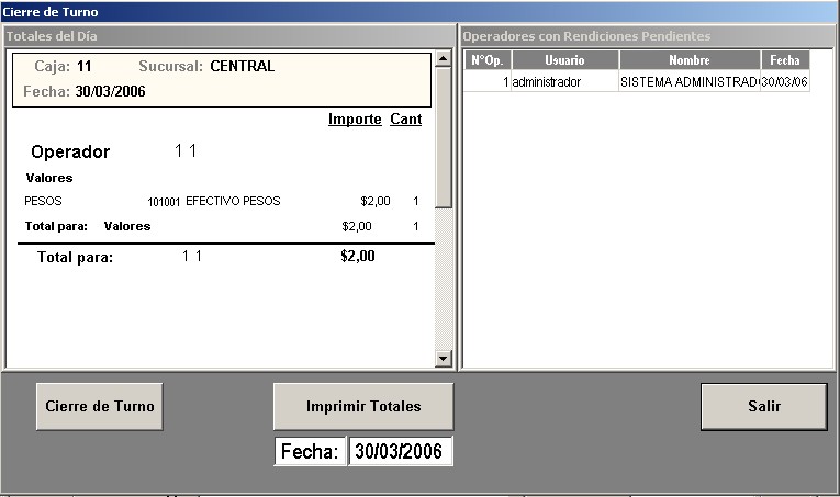Se abre una ventana que informa los totales de las ventas, para realizar el cierre presionar el botón "Cierre de Turno". El sistema solicitará la confirmación de la operación, presionar el botón "Si" para realizar el cierre de turno.