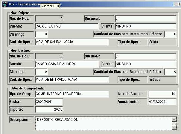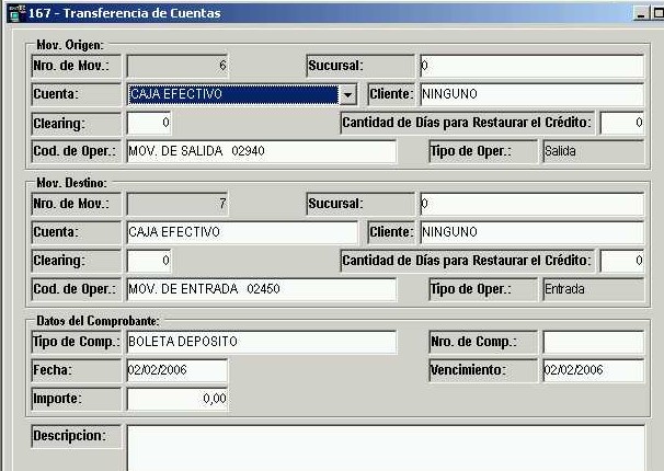 Se presentará la ventana "Transferencia de Cuentas". El ingreso de datos se divide en 3 partes: La primera de ellas es "Mov. Origen", la segunda es "Mov. Destino" y por último "Datos del Comprobante". Ingresar los siguientes datos: