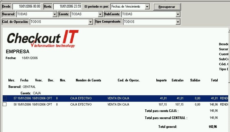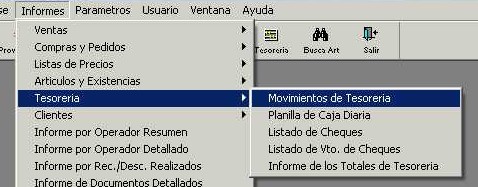 Este informe muestra los movimientos de tesorería agrupados por cuentas de tesorería y por sucursal, aportando totales por cuenta, por sucursal y un total general. Para acceder a este listado, ir al menú "Informes - Tesorería - Movimientos de Tesorería" de la barra de menú.