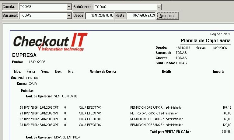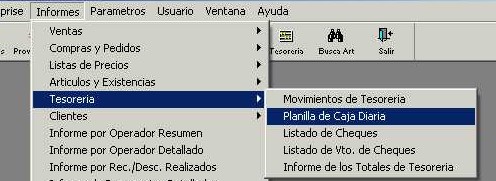 Este informe separa los movimientos de tesorería en dos grupos, los que son entradas y los que son salidas, mostrando los totales de cada grupo y un total general. Además, dentro esos grupos agrupa por código de operación y muestra el total de cada subgrupo. Se accede por medio del menú "Informes - Tesorería - Planilla de Caja Diaria" de la barra de menú.