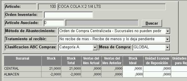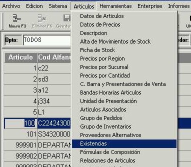Seleccionamos el artículo "100 - COCA COLA 2 1/4 lts" y presionamos el botón EXISTENCIAS de la barra de herramientas. Otra forma de acceder, es a través del menú "Artículos - Existencias" de la barra de menú.