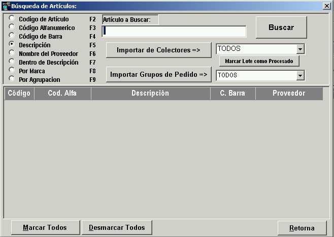 En la pantalla "Búsqueda de Artículos" seleccionamos en la lista desplegable (la que se encuentra debajo del botón "Importar Grupos de Pedidos") el grupo de pedido BEBIDAS. Luego presionamos el botón "Importar Grupos de Pedidos".