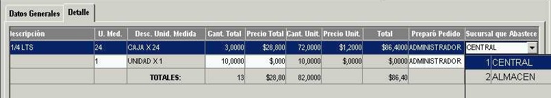Para cada artículo hay otros datos que se pueden ingresar, además de la cantidad pedida. Estos son "U. Med" (Unidad de Medida), "Precio Total", "Preparó Pedido" y "Sucursal que abastece".