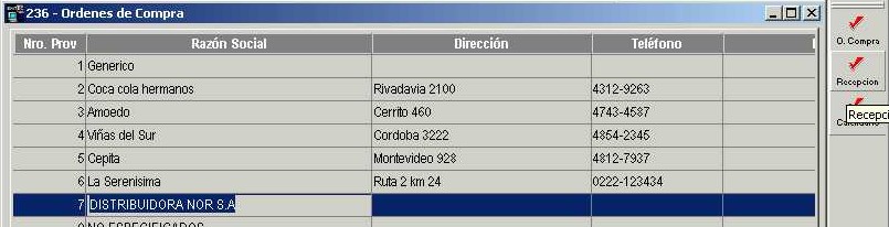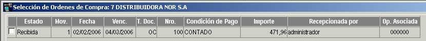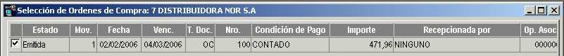 Nos posicionamos en el proveedor DISTRIBUIDORA NOR S.A. y presionamos el botón "Recepción" de la barra de herramientas o accedemos al menú "Orden de Compra - Selección de Ordenes de Compra" de la barra de menú.