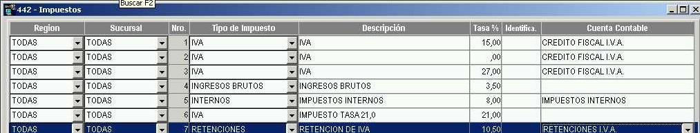Presionamos el botón Nuevo o la tecla F3, nos crea una nueva línea de impuestos y cargamos los siguientes datos: