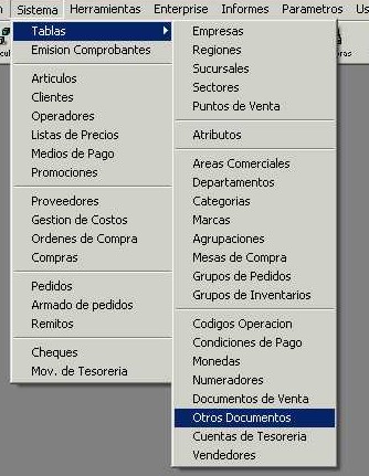 Ingresamos al menú "Sistemas - Tablas - Otros Documentos" de la barra de menú.