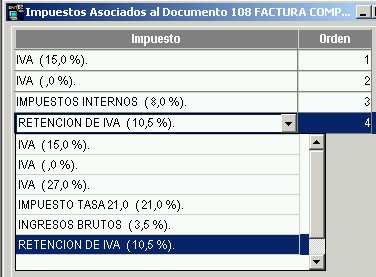 En la tabla que nos presenta, presionamos el botón Nuevo o la tecla F3 y buscamos el impuesto creado anteriormente. Una vez que lo seleccionamos, ingresamos el orden próximo mayor en la columna orden, presionamos el botón Guardar o la tecla F10 y, por último, presionamos el botón Cerrar o la tecla F9.