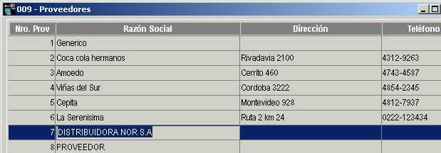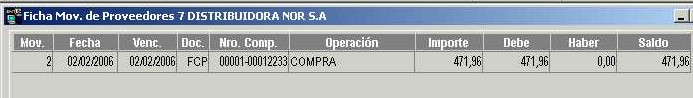 Nos posicionamos sobre el proveedor DISTRIBUIDORA SUR S.A. y presionamos el botón "Cuenta" de la barra de herramientas o accedemos al menú "Proveedores - Ficha de Mov. de Proveedores" de la barra de menú.