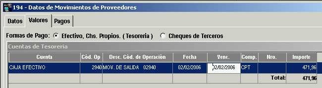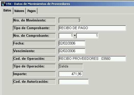 Se abre una ventana llamada "Datos de Movimientos de Proveedores", ingresamos el número de comprobante y el importe.