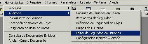 El editor se encuentra en el menú "Herramientas - Auditoría - Editor de Seguridad de Usuarios" de la barra de menú.
