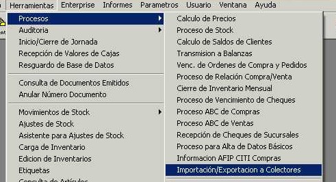 Para importar datos desde este archivo acceder al menú "Herramientas - Procesos - Importación/Exportación a colectores" de la barra de menú.