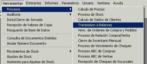 Para transmitir los artículos desde el sistema a una determinada balanza se debe ingresar al menú "Herramientas - Procesos - Transmisión a Balanzas" de la barra de menú.
