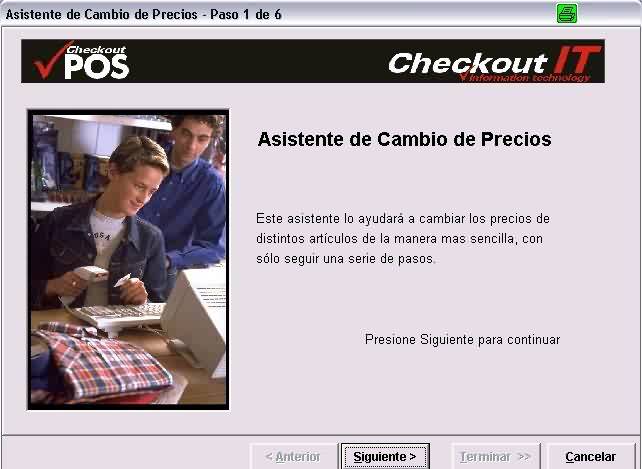 Checkout Store Backoffice posee un asistente para realizar los cambios de precio en forma fácil y rápida. Este asistente permite cambiar precios, ya sea para todos o un grupo de departamentos, categorías de artículos, proveedores y/o sólo artículos individuales. Este asistente consta de 6 sencillos pasos, los cuales son ilustrados y explicados a continuación.