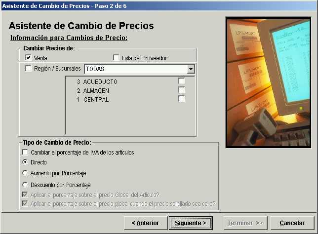 En este paso del asistente, se debe indicar si se quiere cambiar el precio de venta (Precio Vigente) de los artículos, el precio de lista del proveedor (Costo), o el precio de venta (Precio Vigente) por sucursales.