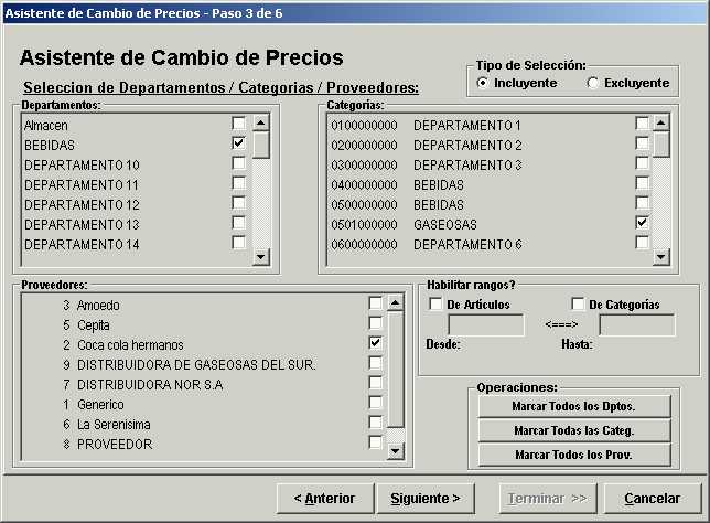 En estas opciones seleccionar con un tilde los departamentos, categorías y proveedores que se quieren incluir en la selección.