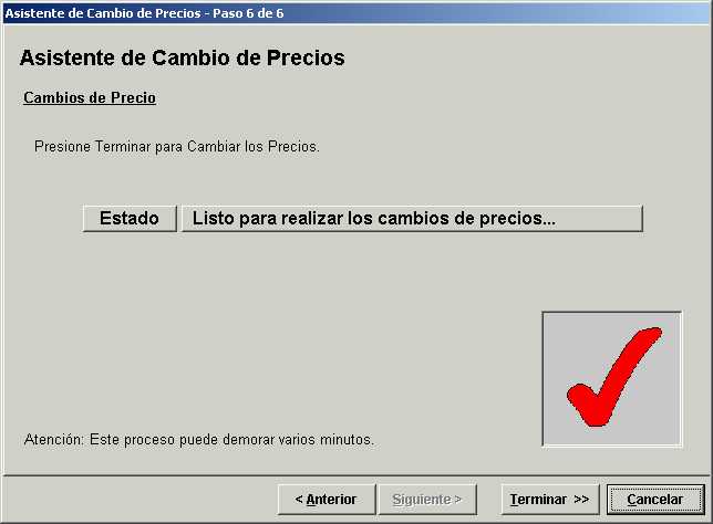Finalmente, presionando el botón "Terminar >>", se finalizará el asistente de cambio de precios. El sistema informa si el mismo se procesó exitosamente.