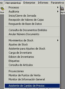 Para acceder al asistente ingresar al menú "Herramientas - Asistente de cambios de precios" de la barra de menú.