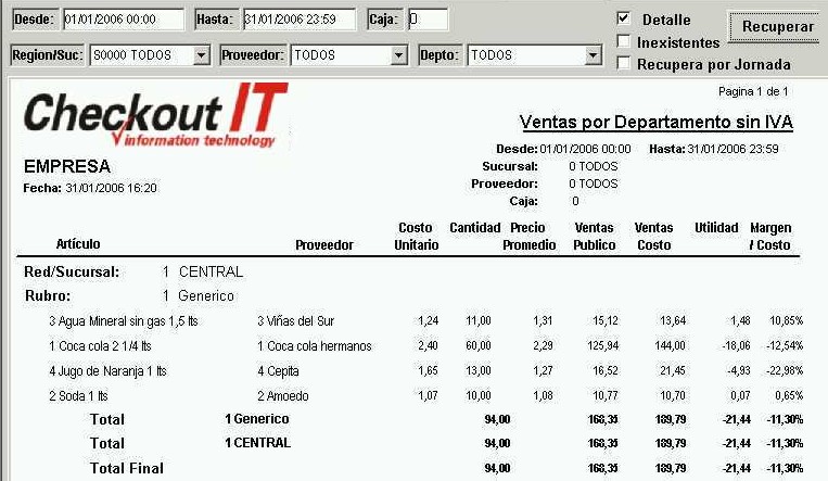 Los filtros disponibles son la fecha desde, la fecha hasta, caja ( 0 = TODAS ), sucursal, proveedor y departamento. Al igual que en todos los informes del sistema, luego de establecer los filtros se presiona el botón "Recuperar" para obtener la información. Además, está presente la opción de ver el detalle de los artículos vendidos en cada departamento. Para esto, se debe marcar la opción "Detalle" antes de presionar el botón "Recuperar".