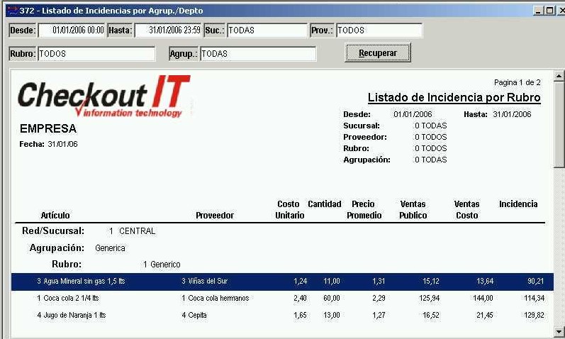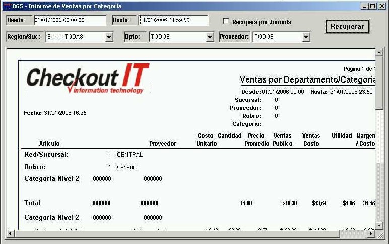 Los filtros disponibles son la fecha desde, la fecha hasta, sucursal, proveedor y rubro (departamento). Al igual que en todos los informes del sistema, luego de establecer los filtros se presiona el botón "Recuperar" para obtener la información.