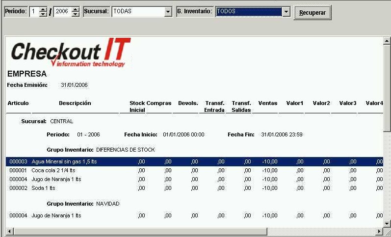 Los filtros disponibles son período (mes / año), sucursal y grupo de inventario. Al igual que en todos los informes del sistema, luego de establecer los filtros se presiona el botón "Recuperar" para obtener la información.
