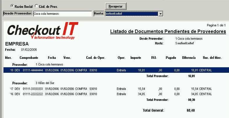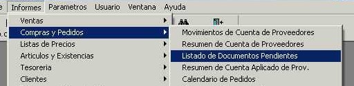 Se accede desde el menú "Informes - Compras y Pedidos - Listado de Documentos Pendientes" de la barra de menú. El listado muestra todos los documentos pendientes que corresponden a cada uno de los proveedores. Es decir, se listan aquellos comprobantes que aún no han sido pagados por la empresa a los proveedores.