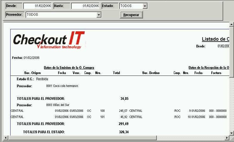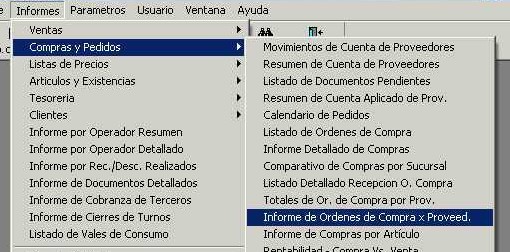 Se accede desde el menú "Informes - Compras y Pedidos - Informe de Ordenes de Compra x Proveed." de la barra de menú. El listado muestra todas las ordenes de compra emitidas para cada uno de los proveedores, informando los datos de la emisión y la recepción de las mismas.