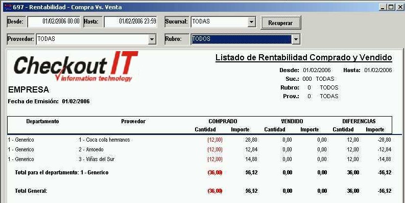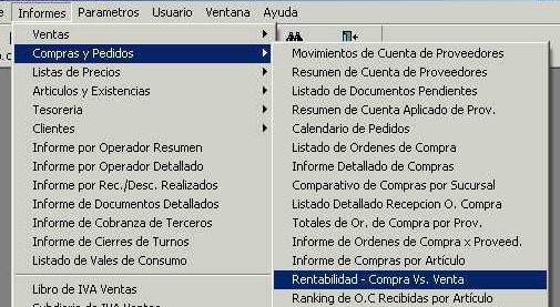 Se accede desde el menú "Informes - Compras y Pedidos - Rentabilidad - Compra Vs. Venta" de la barra de menú. El listado muestra, para cada uno de los artículos, información de las compras, de las ventas y de las diferencias entre ambas. Estos datos están agrupados por rubro (departamento).