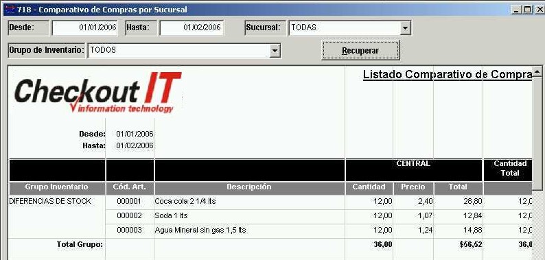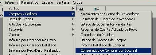 Se accede desde el menú "Informes - Compras y Pedidos - Comparativo de Compras por Sucursal" de la barra de menú. El listado muestra información de las compras realizadas de los artículos en las diferentes sucursales y agrupa esta información por grupos de inventario.