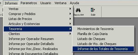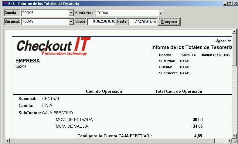 Se accede desde el menú "Informes - Tesorería - Informe de los Totales de Tesorería" de la barra de menú. El listado muestra los movimientos de cada una de las cuentas de tesorería, dentro de cada cuenta se agrupan los movimientos por sub-cuenta. Además se informan los totales de cada una de ellas.